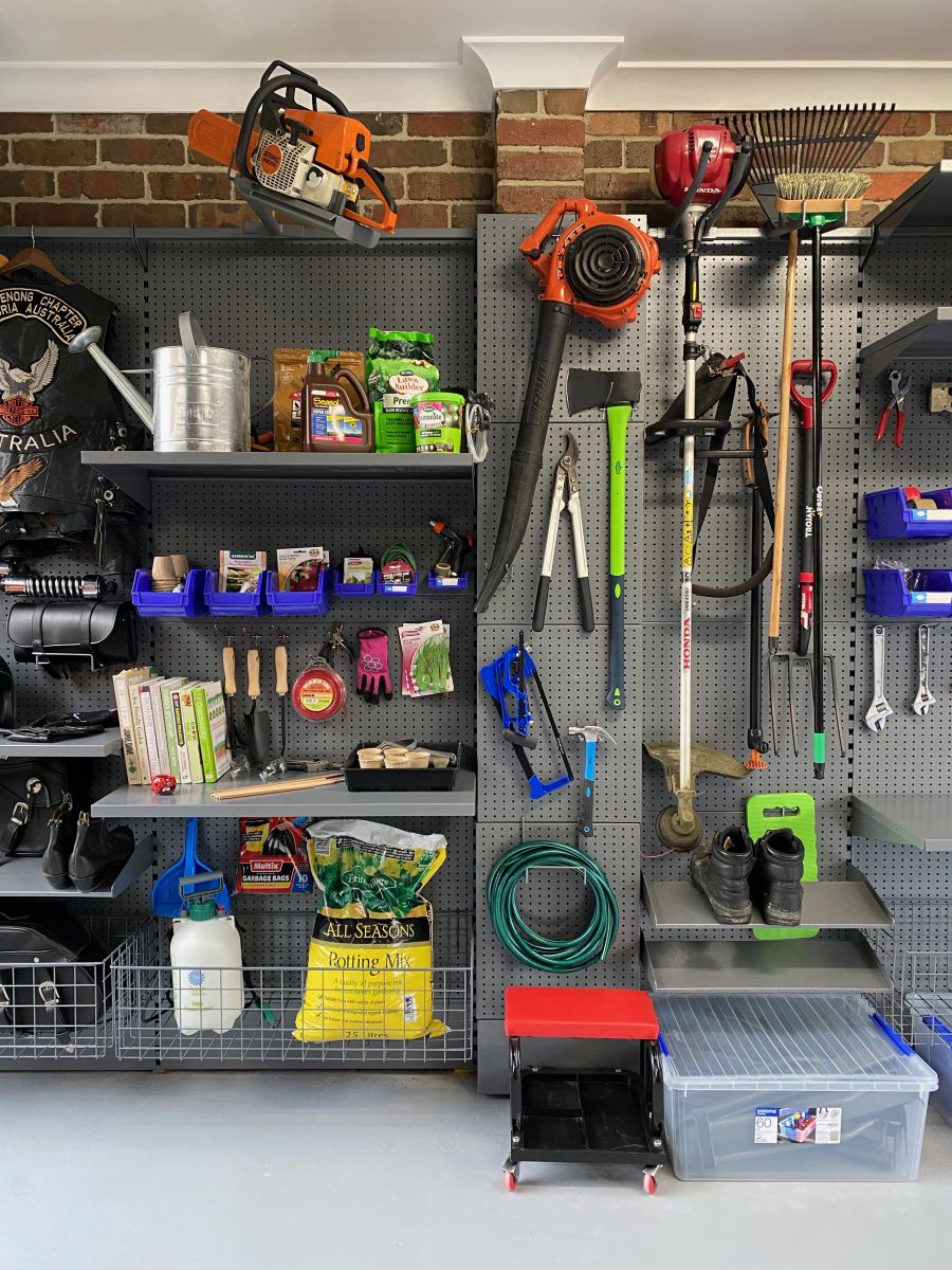 At the base of our wall storage bays, we've slipped in a couple of strong wire baskets. They keep annoying items like balls contained, so they don't end up rolling all over your garage floor.